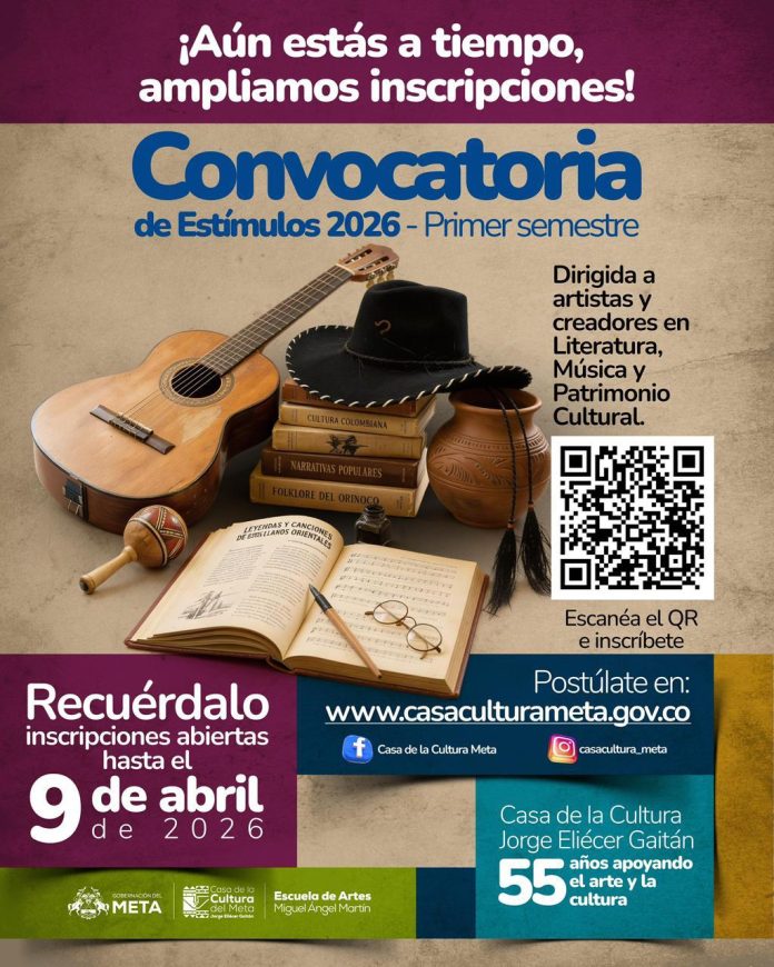 Los interesados podrán conocer todos los requisitos, acceder al formulario de inscripción y completar su inscripción hasta el 9 de abril de 2026, a través del enlace oficial https://www.casaculturameta.gov.co/convocatoria-03-2026/.